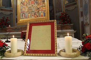 Relic of St. Titus Brandsma Placed in Rome's Sanctuary of New Martyrs The General Congregation of the Order of Carmelites, meeting in Rome since Sept. 5, traveled to the Basilica of St. Bartholomew on the Island (San Bartolomeo all’Isola) on Friday, September 16, the final day of the meeting, to deliver an autographed letter from St. Titus Brandsma. The relic from the new saint was placed in the Sanctuary of New Martyrs in the church. Read more .... + + + La reliquia de San Tito Brandsma se coloca en el Santuario de los Nuevos Mártires de Roma La Congregación General de la Orden de los Carmelitas, reunida en Roma desde el 5 de septiembre, se desplazó a la Basílica de San Bartolomé de la Isla (San Bartolomeo all'Isola) el viernes 16 de septiembre, último día de la reunión, para entregar una carta autografiada de San Tito Brandsma. La reliquia del nuevo santo fue colocada en el Santuario de los Nuevos Mártires de la iglesia. Leer más ... + + + La reliquia di San Tito Brandsma collocata nel Santuario dei Nuovi Martiri di Roma La Congregazione Generale dell'Ordine dei Carmelitani, riunita a Roma dal 5 settembre, si è recata nella Basilica di San Bartolomeo all'Isola venerdì 16 settembre, ultimo giorno della riunione, per consegnare una lettera autografa di San Tito Brandsma. La reliquia del nuovo santo è stata collocata nel Santuario dei Nuovi Martiri della chiesa. Leggi di più ... + + +