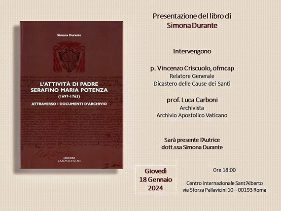 El libro L'attività di padre Serafino Maria Potenza (1697-1763) attraverso i documenti d'Archivio, de Simona Durante, publicado por Edizioni Carmelitane, fue presentado el jueves 18 de enero de 2024, a las 18.00 horas, en el Centro Internazionale Sant'Alberto (Roma).
