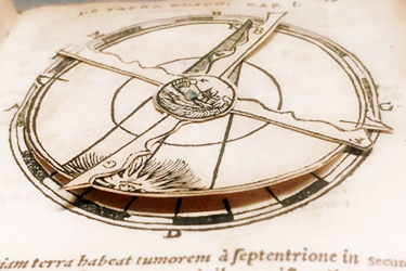 ABiGOC: Archivio e Biblioteca Generali dell'Ordine Carmelitano We present one of the earliest examples of animated books, or pop-up books, that we came across while cataloguing our antique collection. It is a cinquecentina, printed in Lyon in 1567, containing the De Sphaera of the astronomer and mathematician Giovanni Sacrobosco (John of Holywood or Holybush), the most widely read treatise on astronomy in the Middle Ages, especially at the universities. The volume contains numerous three-dimensional illustrations depicting the solar system, intended to extend and complete the author's discussion. In the image, taken from one of the pages of the volume, you can see a reproduction of a lunar revolver, an instrument that allowed the phase, age, and constellation of the moon to be determined. This instrument, composed of several overlapping paper discs, was fixed to the page below by a pin, which allowed each disc to rotate freely around the central axis.