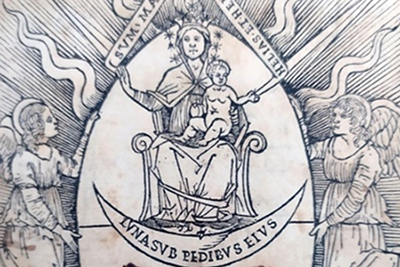 The volume still displays the graphic and book features typical of contemporary manuscripts. The same skilled woodcut artist is most likely responsible for the image preceding the opening page, which depicts the Vexilum Carmelitarum, supported by two angels, with the exquisitely crafted effigy of the Virgin of Mount Carmel in the center.