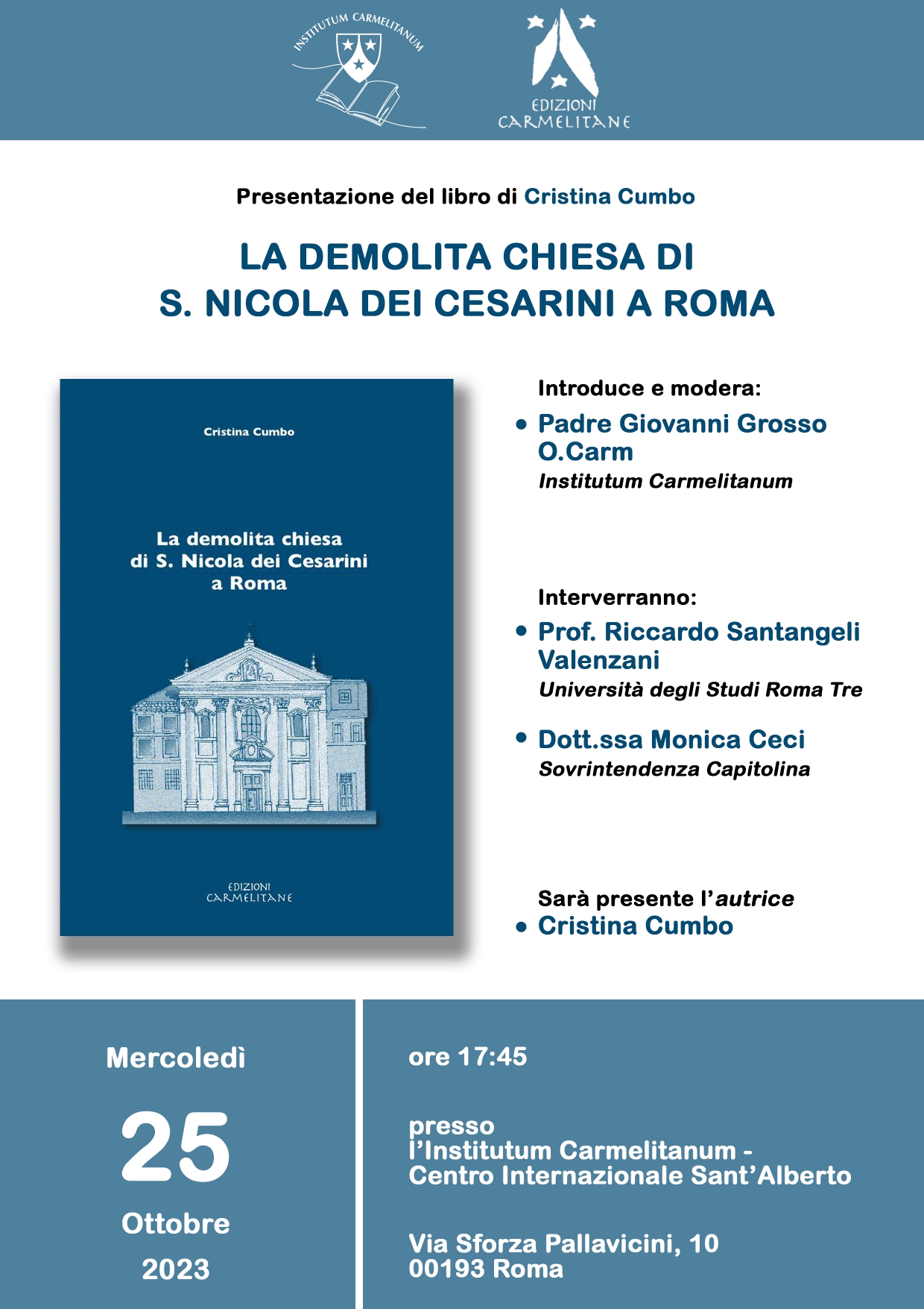 Mercoledì 25 ottobre 2023, alle ore 17:45, presso il Centro Internazionale Sant’Alberto (Roma), è stato presentato il volume La demolita chiesa di S. Nicola dei Cesarini a Roma, di Cristina Cumbo, realizzato attraverso ricerche d’archivio.
