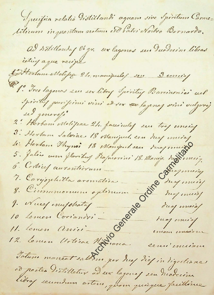 Tra i tesori del nostro archivio abbiamo ritrovato l’antica ricetta dello spiritum carmeliticum, così come ideata da un certo padre Bernardo, presumibilmente sul finire del secolo XVIII. Di padre Bernardo non conosciamo né il cognome né il convento di appartenenza, ma sicuramente il suo amaro dovette essere molto apprezzato se la sua ricetta arrivò fino alla Curia generalizia dei carmelitani.