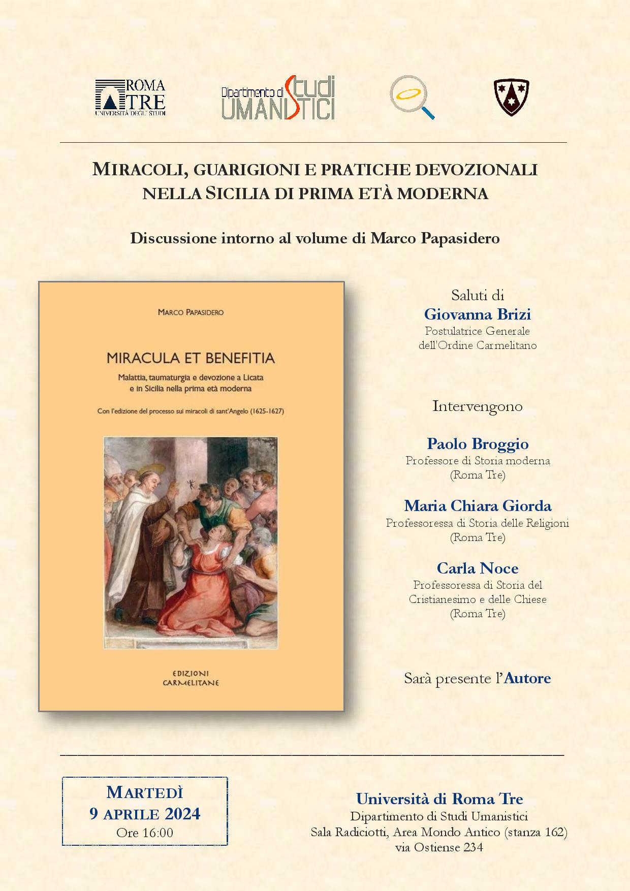 Martedì 9 aprile 2024, alle ore 16, presso l’Università di Roma Tre, Dipartimento di Studi Umanistici, sarà presentato il volume Miracula et benefitia. Malattia, taumaturgia e devozione a Licata e in Sicilia nella prima età moderna (Edizioni Carmelitane, 2021), realizzato attraverso ricerche d’archivio.