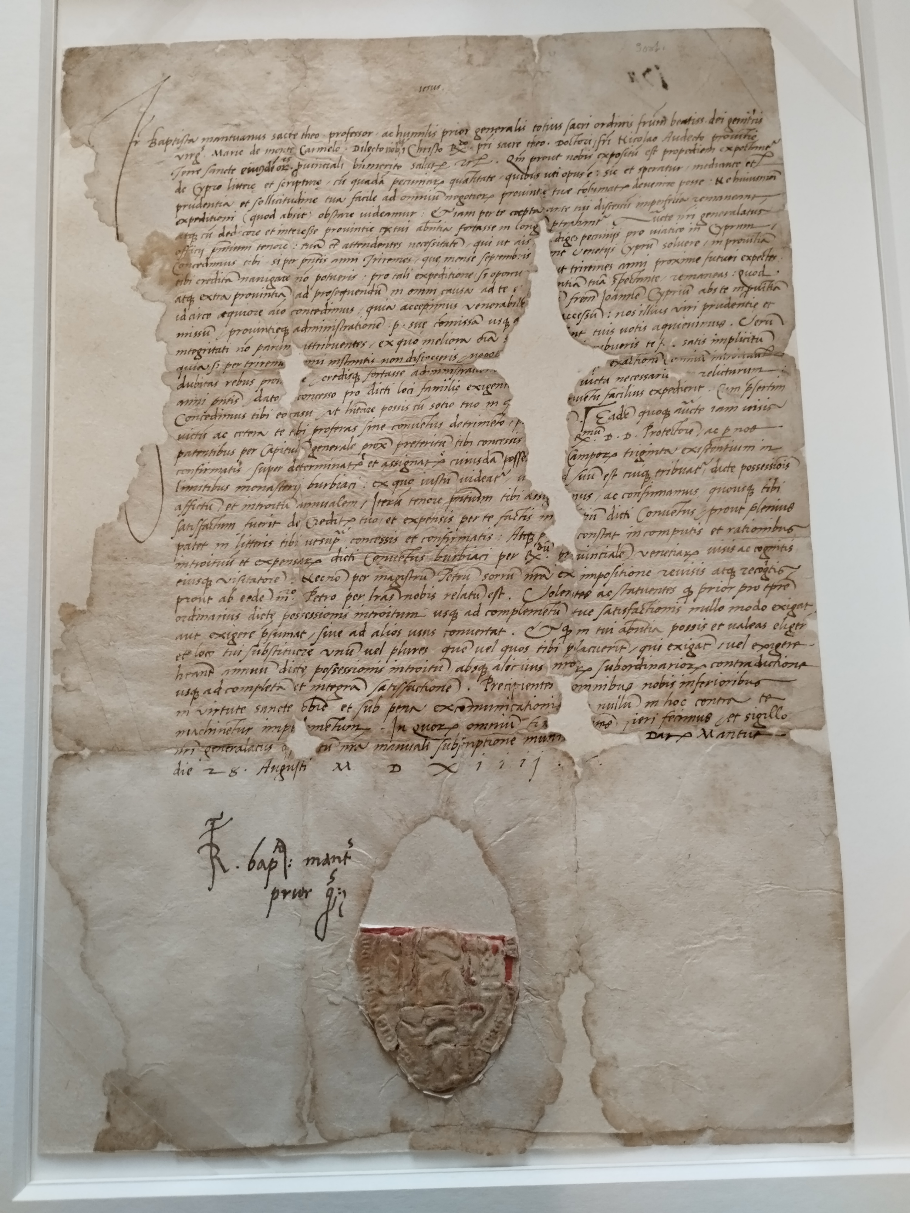 Il beato Giovanni Battista Spagnoli, detto il Mantovano (1447-1516), umanista e poeta carmelitano, guidò per un lungo periodo la Riforma Mantovana, divenendo poi, nel 1513, priore generale dell’Ordine. Nella lettera autografa del 28 agosto 1514, che qui vi mostriamo, il Mantovano scriveva a Nicolò Audet (1481-1562), divenuto provinciale di Terra Santa, ordinandogli di recarsi a Cipro, sede della suddetta provincia, per prenderne possesso. L'Audet, infatti, ritardava il proprio trasferimento da Venezia, dove aveva risieduto fino a quel momento. Si tratta di una corrispondenza tra due personalità di spicco della storia carmelitana: un generale in attività, il Mantovano, e un futuro generale, l’Audet, che dieci anni più tardi sarebbe stato eletto anche lui a capo dell’Ordine.