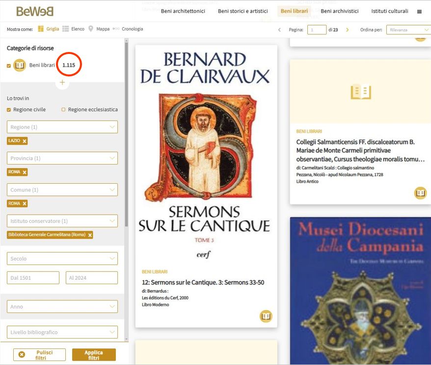 Siamo lieti di informarvi che l’attività di catalogazione del patrimonio librario della Biblioteca Generale Carmelitana sta procedendo a pieno ritmo e ha condotto, attualmente, all’inserimento di 1.115 record bibliografici (tra volumi antichi, moderni e nuove acquisizioni), all’interno del portale degli istituti culturali ecclesiastici BeWeb, in collegamento con il più ampio sistema di catalogazione nazionale Opac SBN.