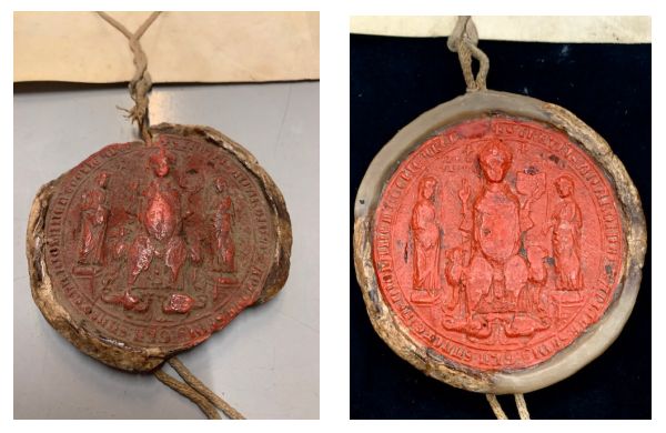 Da alcuni anni, grazie ai contributi dell’8xMille della Conferenza Episcopale Italiana destinati ad Archivi e Biblioteche ecclesiastiche, il nostro archivio ha potuto programmare e commissionare alcuni interessantissimi progetti di restauro dei sigilli conservati nella Sezione Diplomatica.