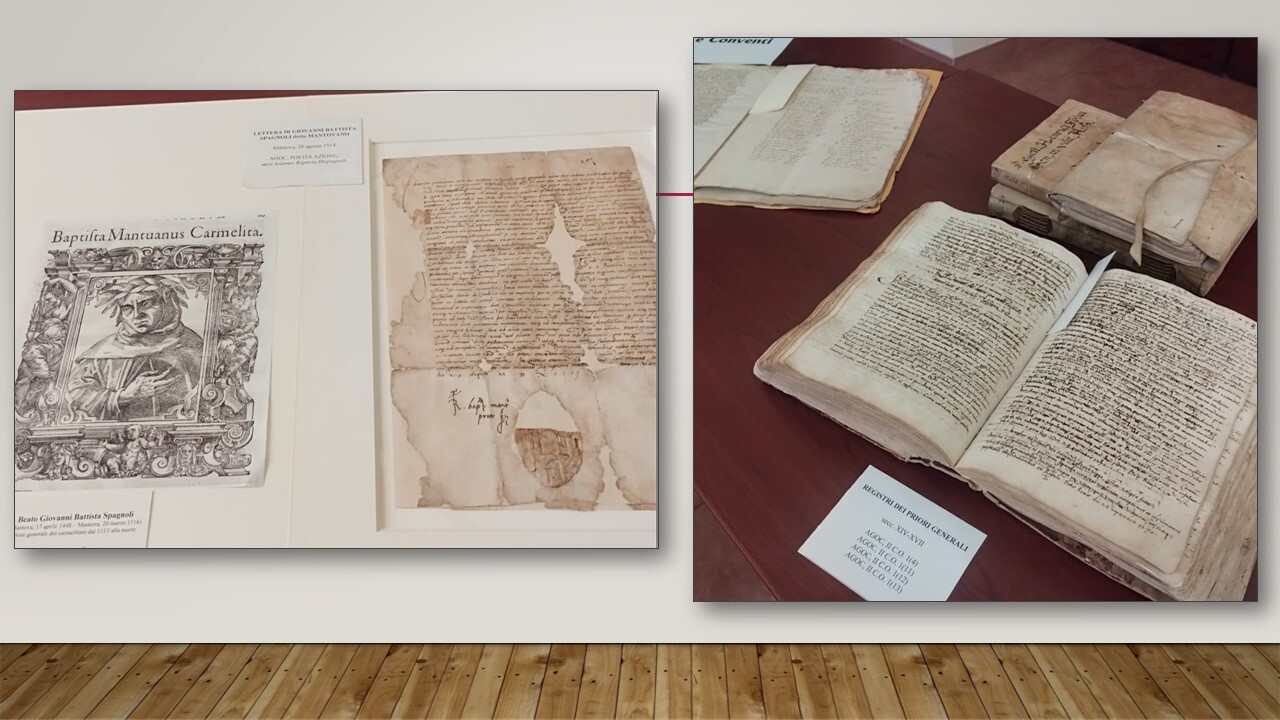 Inoltre, sono stati selezionati e descritti numerosi documenti d’archivio, in pergamena e carta, grazie ai quali Simona ha potuto raccontare la storia dei carmelitani, partendo dalle origini sul Monte Carmelo fino all’arrivo dei frati nel Mediterraneo occidentale intorno alla metà del XIII secolo, eventi attestati da una breve rassegna di bolle e brevi pontifici. Sempre attraverso testimonianze d’archivio, sono poi stati illustrati i momenti salienti del governo generale dell’Ordine, dai più antichi capitoli generali, che durante il Medioevo erano celebrati in giro per l’Europa, fino alla stabilizzazione - nel corso del Cinquecento - della sede della curia generalizia carmelitana a Roma, nel convento di Traspontina, per arrivare alla costruzione, nei primi anni del Novecento, del Collegio Internazionale Sant’Alberto (CISA), con l’esposizione di planimetrie e fotografie d’epoca raffiguranti l’edificio che ancor oggi ospita i nostri istituti. Un particolare risalto è stato dato alla sezione documentaria della Postulazione generale, con la messa in mostra di alcuni pezzi relativi ai processi di beatificazione e canonizzazione di personaggi carmelitani, in special modo i beati Giovanni Battista Spagnoli detto Mantovano (1448-1516) e Angelo Paoli (1642-1720).